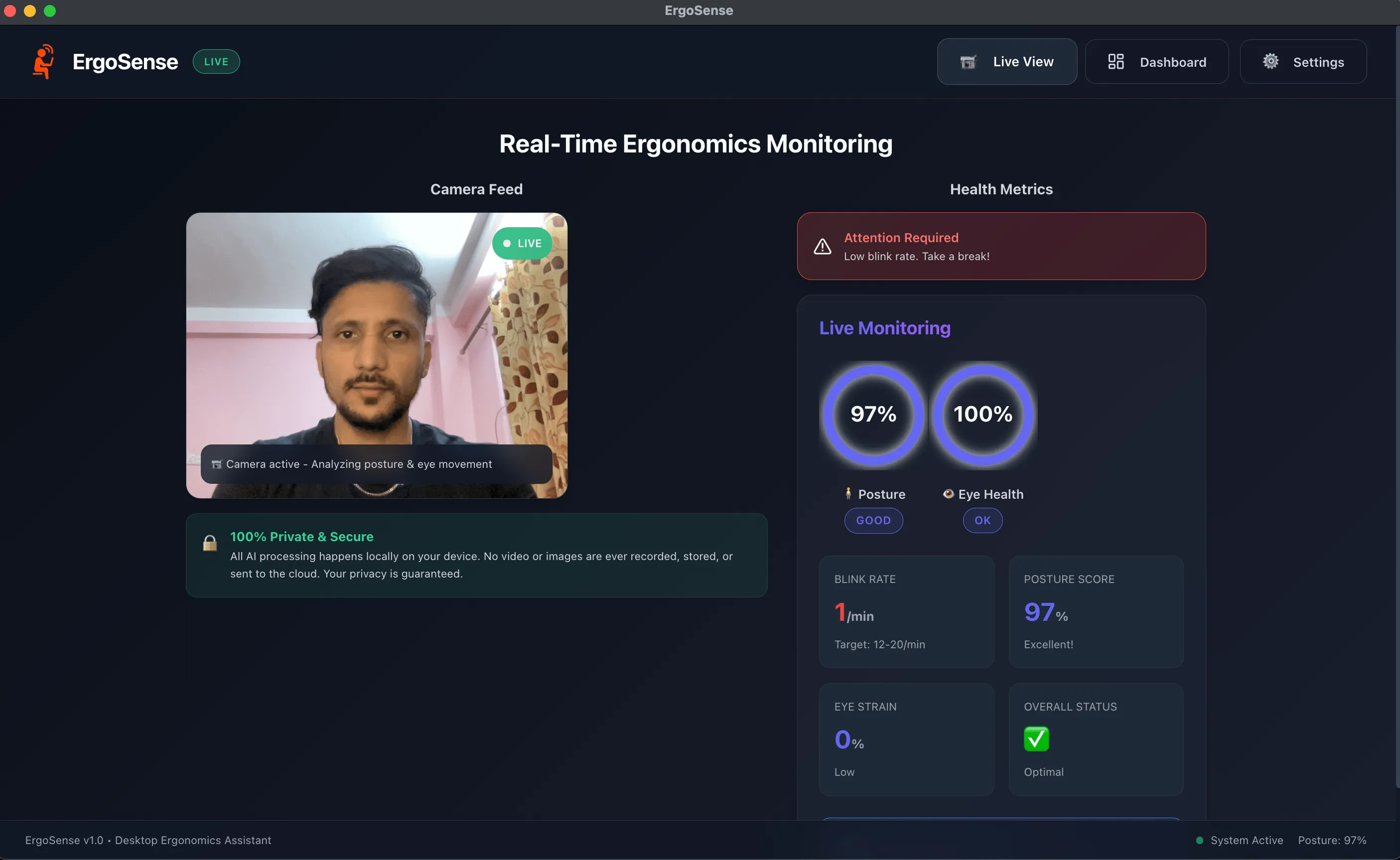 ErgoSense uses advanced local AI to monitor your ergonomics in real-time, helping you stay healthy and productive without ever compromising your privacy.